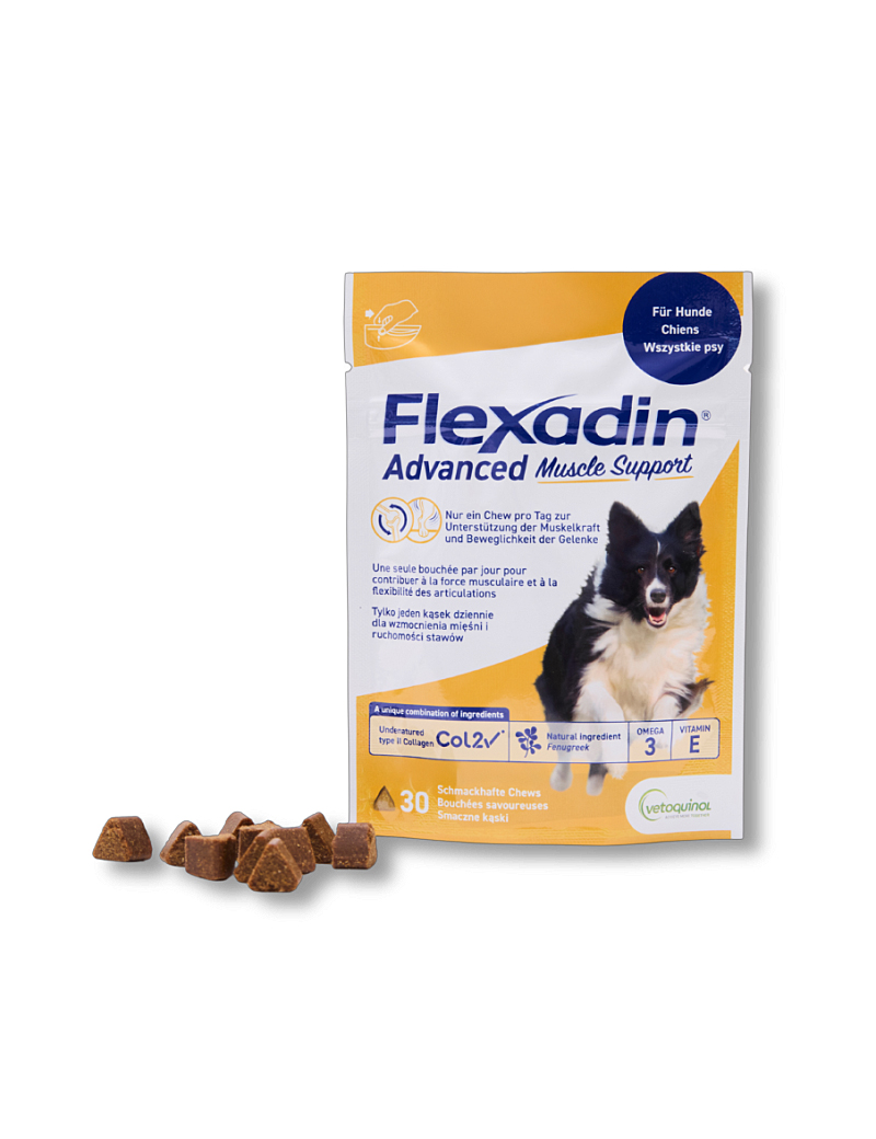 Flexadin Advanced Muscle Support on maitsev ja mugav üks kord päevas antav närimismaius, mis sisaldab lambaläätse seemneid, mis aitavad loomulikult optimeerida lihaste energiakasutust ja võimaldavad säilitada kõrget koormust.